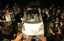 印度塔塔汽车公司近日在新德里举行的一个汽车展上推出一款名为名为Tata Nano的小车,售价预计为2500美元。业内人士对这款价格超低的新车褒贬不一。塔塔汽车公司董事长拉坦·塔塔说,在印度,许多四口之家共乘一辆摩托车出行,父亲驾驶,母亲坐后座,中间夹坐着两个孩子。他希望这款价格低廉的新车能让工薪族家庭的出行更为安全,并促使其他汽车企业降低车价。新华社/法新