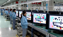 图为四川长虹的员工正在平板电视生产线上进行产品调试。