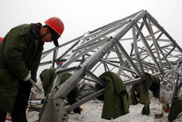 近日,严重的雪凝灾害造成贵州电网大面积损毁,全省近一半县市相继断电。尽管山高坡陡、抢险艰苦,但贵州1.7万多名电力职工发扬“不怕吃苦、不畏严寒”的精神,昼夜奋战在抗灾第一线。图为南方电网公司贵阳供电局的抢险人员正在重建电塔。