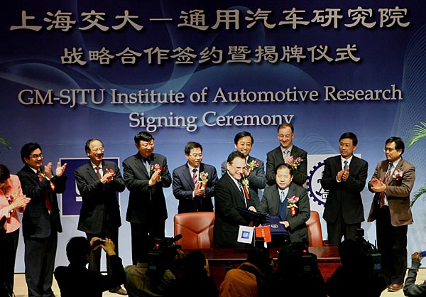近日,上海交通大学——通用汽车研究院在上海交大正式成立。通用汽车按计划在未来五年内为研究院投入400万美元,用于推进通用汽车与上海交大在汽车联合体技术研发及专业人才培养领域内的合作。这是上海交通大学——通用汽车研究院战略合作签约仪式现场。