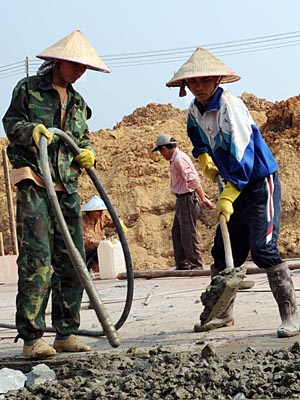 2008年3月11日,广西钦州市的建筑工人正在给一在建农村公路浇灌混凝土。