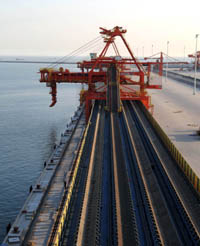 日前,国投曹妃甸煤炭码头一期工程基本完工,将于6月份投产。国投曹妃甸煤炭码头规划建设5至10万吨级煤炭泊位16个,年煤炭下水能力2亿吨。这是曹妃甸煤炭码头安装完毕的装船机。 本报记者:杨世尧