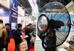 日前,第八届中国国际暖通空调博览会在北京举行。此次博览会以关注人居环境为主题,吸引了200余家国内外知名企业参展。图为记者拍摄的具有加湿功能的工业电风扇。