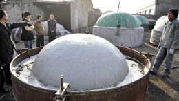 内蒙古自治区今年将在60个旗县的500个村建设10万个农村家用沼气池,以帮助解决农村家庭的做饭、照明等问题,减少农村煤炭和柴草的使用量。完成后内蒙古农村牧区家庭用沼气保有量将达14万6千户。图为内蒙古突泉县节能站工作人员在测试沼气池顶盖的气密性。