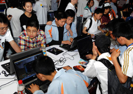 日前,第四届中国国际动漫产业博览会在杭州开幕。在看似简单的电子游戏、动画片等动漫产业终端产品的背后,是一整条包括科技研发、制作、销售和动漫形象衍生产品开发的产业链,据估计,中国动漫游戏产业年总产值在180亿元左右。图为一些学生围聚在电脑前尝试新的电脑游戏。