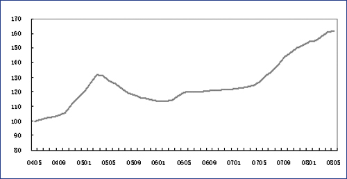 2008年5月,中原(上海)领先指数为162点,样本成交均价为18437元/平方米,环比上涨0.63个百分点,在成交价格保持高位的同时,5月二手房成交量却有所回落,根据中原统计数据显示,本月成交量较上月减少了20%左右。总体来说,5月上海二手房市场呈现价稳量跌的态势。