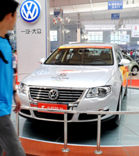 为期一周的第三届中国长春汽车工业展览会6月27日在长春国际会展中心开幕,共有国内外32个品牌的300辆车在此次车展中“同场竞技”。图为一汽-大众携奥运火炬传递车在车展中亮相。