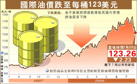 7月25日,国际几大石油交易市场的表现创下了一段时间以来的价格新低。当天,纽约商品交易所9月份交货的轻质原油期货价格开盘后一路下跌,触底至每桶122.50美元,收盘时报于123.26美元,比前一个交易日下跌了2.23美元。伦敦国际石油交易所9月份交货的北海布伦特原油期货价格下跌1.92美元,收于每桶124.52美元。