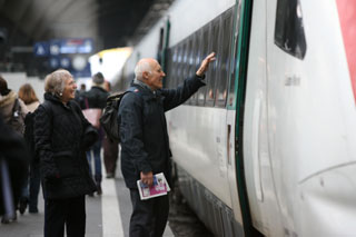 尽管在瑞士苏黎世州每千人拥有私人汽车超过800辆,但是仍然有60%的居民在高峰时段选择公共交通工具出行。由49家公交运营公司组成的苏黎世公共交通网络提供铁路、公共汽车、有轨电车、无轨电车、湖船等服务,其中轨道交通通车里程约为600公里。乘客一票在手可以在所购车票规定时间内不限次数乘坐任意公共交通工具。图为在苏黎世的中央车站,两位老人与亲友道别。