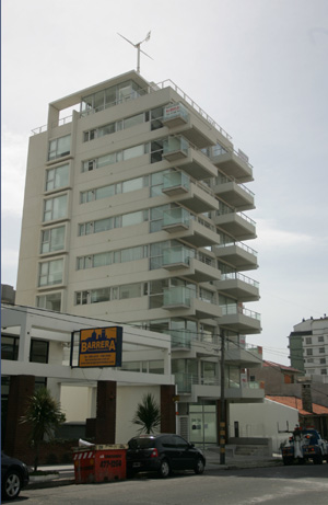 这是日前在阿根廷海滨城市马德普拉塔拍摄的“风神大楼”的整体外观。一座被命名为“风神大楼”的环保型住宅楼2008年8月在马德普拉塔正式投入使用。它是拉美首座完全依靠风力发电来供电的大楼。这座大楼先进的风力发电装置可以满足整幢大楼的电力需求。