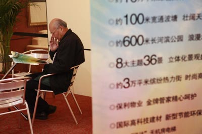 近日,第24届中国上海房地产展示交易会在上海展览中心开幕,近百家开发商携150多个楼盘前来参展,这是房产新政出台后沪上首次大型房展。尽管展会上开发商推出了各种各样的购房优惠,但大部分消费者持理性的观展态度,性价比高和保值性好的楼盘备受关注。图为一位市民正在一处促销楼盘的展位前查阅详细资料。