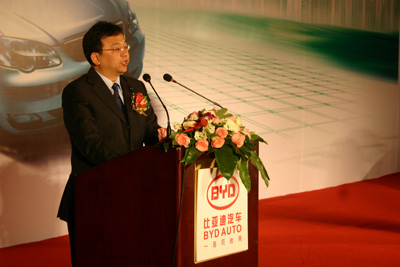 比亚迪公司董事长王传福在全球首款比亚迪双模电动车上市仪式上致辞。 | 12月15日,由我国汽车制造企业自主研发、生产的世界第一款双模电动车——比亚迪F3DM在深圳宣告上市。这对正在遭受百年不遇“经济寒流”的全球汽车业来说,无疑是一声给人带来信心和希望的春雷。一直在奋力追赶的中国汽车制造业也因此被定格在了全球新能源汽车领跑者位次。