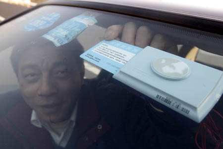 2008年12月31日,长三角(江苏、上海)高速公路电子不停车收费系统举行开通仪式。图为一名司机使用车内安装的ETC收费系统。