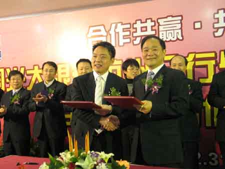 2008年12月31日,中国光大银行与浙江吉利集团签约,为吉利汽车提供10亿元授信额度,以支持吉利汽车发展,平稳健康“过冬”。根据协议,其中2.5亿元将用作吉利中期流动资金,7.5亿元用于对经销商的融资支持。图为光大银行杭州分行行长闫桂军(前左)与浙江吉利控股集团董事长李书福(前右)签约成功。