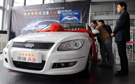 1月20日,几位顾客在安徽合肥一家奇瑞汽车4S店观看一辆两厢奇瑞A3轿车。本报记者:陈晔华 摄