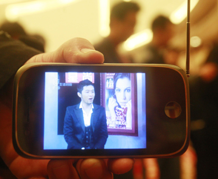 日前,“中国移动多媒体广播上海商业运营启动暨合作签约仪式”在上海国际会议中心举行,这是在签约仪式现场拍摄的手机电视。中广卫星移动广播有限公司与上海东方明珠集团正式签约,东方明珠集团旗下的上海文广手机电视有限公司成为上海地区CMMB手机电视的运营商。目前,CMMB手机电视的资费、节目等框架已基本成形,上海市民不久后就可以订购和开通CMMB收视服务。