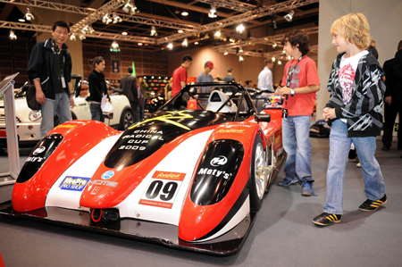 参观者在车展上观看一辆RADICAL SR3汽车。