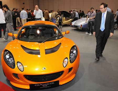 参观者在车展上观看一辆Exige S Sport汽车。