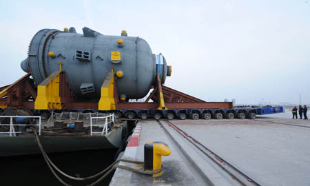 天津石化100万吨乙烯及配套项目整台重量最重、最昂贵的设备——EO反应器日前在天津临港顺利完成滚装卸船作业。据介绍,该设备本体净重1182吨,采购价格逾2亿元人民币。图为施工人员在进行EO反应器卸船作业。