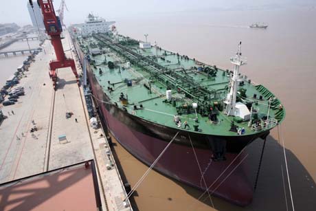4月15日,由浙江舟山金海湾船业有限公司建造的11万吨级油轮“海湾号”正式交付船东——挪威金色海洋航运公司。这标志着浙江迈入了制造10万吨以上级船舶大省的行列。售价高达4.35亿元人民币的“海湾号”长243米、宽42米、载重吃水深度22米、最大航速15节、排水量11万吨,总体性能达到国际先进水平。图为“海湾号”油轮准备首航。