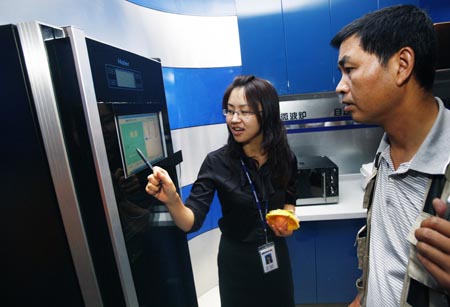 工作人员正在向观众介绍一款智能冰箱,这款冰箱可以自动显示“肚子”里食物的种类和数量。