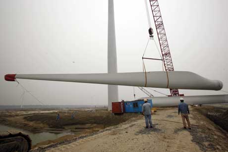 工人们正在江苏如东风电特许权二期项目吊装电机组的叶片。位于江海交汇处的江苏如东,拥有106公里长的海岸线。区内滩涂广阔,周围环境空旷,沿海年可供发电有效风时近8000小时。新华社记者