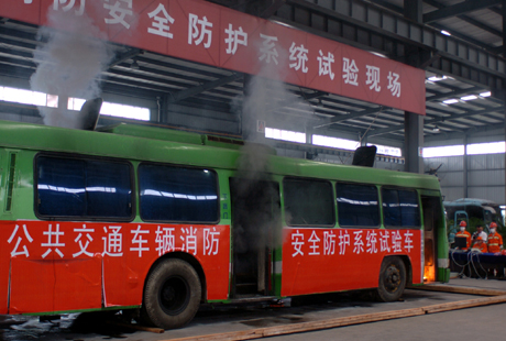 “防火公交车”通过专家鉴定。由公安部消防局、四川省科技厅等单位的专家组成的鉴定委员会认为,这项科技成果具有高效、环保、经济的特点,达到国内先进水平,具有较好的应用推广前景。图为9月3日在试验现场,“公共交通车辆消防安全防护系统”在3秒内启动,并在10秒内控制了火势。