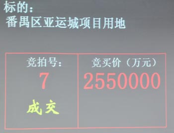 2009年12月22日,农历冬至,然而在广州市房地产交易中心3楼拍卖大厅却是一片火热。 在这里,全国房地产巨头齐聚,虎视眈眈,目标就是263万平方米的广州亚运城土地。广州市国土房管局局长谢晓丹也破天荒地到场观战。拍卖场内被观战的人群围得水泄不通。约百家媒体更是架起了长枪短炮来见证这一中国拍地史上的纪录。 广州市国土房管局公布的资料显示,亚运城地块位于广州新城东北部,规划总用地面积约264万平方米,地上总建筑面积为438万平方米,规模庞大。据统计,今年以来广州挂牌出让了19幅住宅用地,用地面积约146万平方米,仅为亚运城项目用地的55%。由于项目开发成本高,房地产企业纷纷选择联合竞拍。 15时,3个竞拍联合体7个开发商已经到齐入座,其中包括富力地产、碧桂园等民营地产公司组成的7号竞买团队,保利地产、万科地产、中海地产等国有房地产企业组成的88号竞买团队,以及独立竞买的6号中信地产。 起拍价为180亿元,竞价阶梯为2亿元,也即举一次牌就要多付出2亿元,也意味着举一次牌就要增加楼面地价61元/平方米。然而竞拍开始之后,单刀赴会的中信地产却一直未举牌,争夺就在7号富力联合体与88号保利联合体之间进行。 “200亿元!”开拍几分钟之后,88号保利联合体率先叫价至200亿元。这是业界专家猜测的价位,这也是一个心理价位。 “下一个价位202亿元,或者你喊出高于202亿元也行。”拍卖师试图鼓励举牌。显然,这场拍卖中,由地产商组成的3大竞拍联合体并非是游戏的全部角色,希望将土地卖个好价钱的地方政府也是一个重要的扮演者。 在短暂的静默与期待之后,富力联合体继续叫价,一举打破了业内心理关口,并引发全场鼓掌。在富力联合体将地价叫到255亿元的时候,保利联合体不再继续叫价。“255亿元第一次……255亿元第二次……255亿元第三次,成交!”伴随着一声响亮的棰声,亚运城项目在历时半个钟头经过47轮叫价之后被富力联合体竞得。