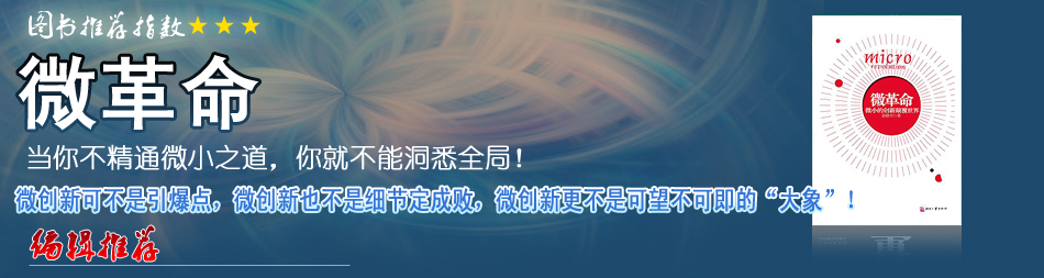 谁最应该成为“微杀手”? 在人类社会的商业竞争中,要想成为出奇制胜的“微杀手”靠什么?当然要靠“微创新”了。“微创新”与传统的创新有何不同?更难还是更容易?有哪些规律和法则?这种“微创新”是否真的会引爆一场互联网时代的“微革命”?对于所有类似问题,《微革命》一书都进行了有血有肉、令人信服且激荡人心的回答。而我与这本书发生的“化学反应”,则延伸到了更为广阔复杂的社会生活、人文传统等领域…[详细] |