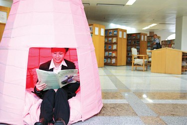 部分艺术品被置放在不起眼的角落。伴随书香,在上海图书馆里与这些艺术品相遇令人意外。过道旁,一个粉红圆帐篷,里面铺着垫子,垂下一盏吊灯,这个温馨小窝叫做“私人阅读灯”,可以钻进去看书、静思。设计师林天苗说:“我在公共阅览室看书很容易走神,非常想要一个私密的阅读空间,于是就创造了这个作品。”