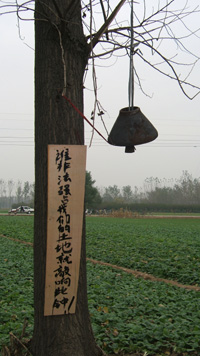 “谁非法侵占我们的土地就敲响此钟!”面对越来越多非法圈地者,前不久,河南省中牟县白沙镇白坟村村民在本村耕地旁的大树上立了一口老钟,以便随时召集村民“抵抗”非法占地者。新华社记者:单纯刚