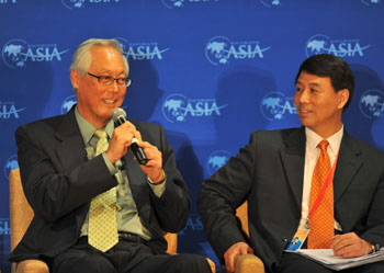 反贸易保护主义事关全球经济复苏。4月10日,博鳌亚洲论坛“贸易保护主义:全球经济脆弱复苏的现实威胁”主题午餐会在海南博鳌举行。图为新加坡前总理、国务资政吴作栋(左)在发言。新华社记者 郭程/摄 |