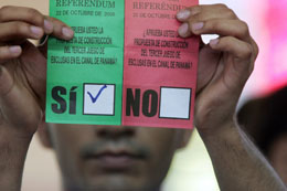 巴拿马22日就巴拿马运河扩建举行全民公投,公投的初步统计结果显示超过78%的投票者支持运河扩建,运河扩建计划获得通过。 根据国家计票委员会公布的数字,共有77.2万巴拿马选民(占选民总数43%)参加了22日的投票。运河扩建将在2007年至2008年期间动工,工期为七至八年,总投资为52.5亿美元。 图为10月22日,在巴拿马首都巴拿马城,一名计票工作人员展示一张划上“同意”的选票。