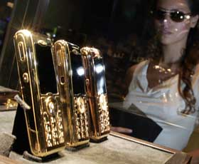 27日,一名参观者在莫斯科举行的奢侈品展览会上欣赏一款镀金手机。奢侈品云集的莫斯科奢侈品展是欧洲顶级奢侈品展览之一,本次展览于10月27日开始,将在10月30日结束。