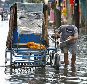 30日,在菲律宾首都马尼拉郊外的马拉邦,一名居民在强台风“西马仑”带来的积水中艰难行进。当天,强台风“西马仑”继续在菲律宾吕宋岛北部肆虐,已经造成至少2人死亡。