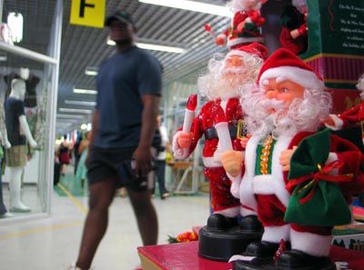 11日,在南非约翰内斯堡的东方商城,购物者走过产自浙江义乌的圣诞老人玩偶。南非的圣诞礼品市场现已进入最红火的销售阶段,中国制造的圣诞礼品因为物美价廉、品种多样而受到当地消费者欢迎。