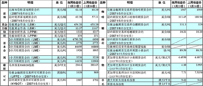 在美国汽油库存持续下降、炼油厂原油需求增加、美联储决定将联邦基金利率保持在5.25%水平不变,以及交易者担心中东地区局势更趋紧张等多重因素的共同作用下,当周国际油价总体呈上升之势。 美国能源部21日公布的数据显示,在截至3月16日的一周里,美国汽油库存下降340万桶,包括柴油和取暖油在内的其他成品油库存下降170万桶。另外,当周美国炼油厂设备开工率为86.3%,比前一周有所上升。市场分析人士指出,这显示在夏季汽油消费高峰期到来之前,美国炼油厂正在扩大生产。当日,美联储还决定将联邦基金利率保持在5.25%的水平不变,这有利于美国经济继续保持增长,进而有可能使得美国原油需求继续保持旺盛势头,这些因素都推动了油价走高。 此外,伊朗外交部23日证实于当天早晨在海湾扣留了15名英国海军人员,交易者担心该事件可能导致中东地区局势更趋紧张,这也成为推高油价的一个重要因素。 在美元走低和油价上涨双重因素的影响下,黄金的期货价格上扬,铂、钯等其他贵金属价格也跟着走高。基本金属价格则是涨跌互现,其中铜价和锡价升势较猛:受中国需求增加等因素影响,铜价升至今年以来最高点——每吨6865美元;锡价也因主产地印度尼西亚国内存在的生产问题而升至历史新高——每吨14351美元。 玉米、小麦以及大豆的价格纷纷上涨,艾伦代尔公司分析师乔·维克托认为,由于预计需求仍然强劲,玉米和大豆价格的长期走势依然看涨。因市场担忧西非的可可收成可能较低,在投机性购买因素的支撑下,伦敦和纽约两地可可价格纷纷升至三年多来高点。同样在投机性购买因素的刺激下,咖啡价格上扬。 由于出现不利于橡胶生长的干燥天气,再加上日本市场存在抬高价格的投机交易,橡胶价格被推高。