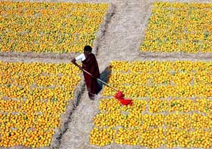 在印度海得拉巴的一处水果批发市场里,一位卖主在清理桔子。印度位于南亚地区,盛产热带以及亚热带水果。经济参考报资料照片 |