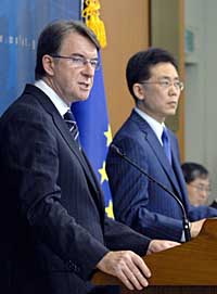 6日,欧盟贸易委员曼德尔森(左)和韩国外交通商部通商交涉本部长金铉宗在韩国首都首尔出席新闻发布会。韩国与欧盟当日宣布正式就签署自由贸易协定问题进行谈判,双方预计今年将举行5至6轮会谈,以尽早达成协议。新华社/路透 | 本报东京电