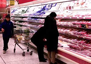 顾客在一家英国超市选购食品。本报资料照片 | 为有效减少温室气体排放量、保护环境,英国政府计划将商品在生产、运输和消费过程中的温室气体排放量计算成数字,并制作成标签贴在包装上。今后,消费者可以凭借这一数字,选择物美价廉的环保商品。