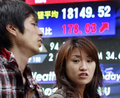 18日,两名行人从日本首都东京的一个显示股票信息的电子显示屏前走过。日本最大的证券交易所东京证券交易所最新公布的股票分布情况调查结果表明,截至日本2006财政年度末(2007年3月底),在东京证券交易所等日本国内5家证券交易所(二板市场除外)交易的股票总值中,外国股东持有的比例达到28%,创历史最高纪录。