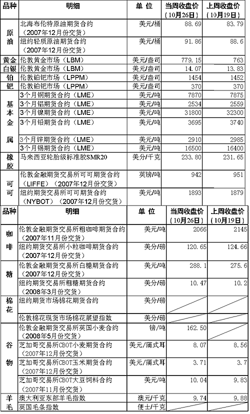 当周芝加哥小麦期货价格连续几个交易日深度下跌,盘中一度跌破每蒲式耳8美元大关。分析师称,这一方面是因为全球主要的小麦进口国可能在前一阶段已购进大量小麦,导致美国小麦的出口速度短期内下滑;另一方面,有关澳大利亚小麦减产的消息已被市场吸收,同时小麦种植面积预计在明年又将大幅度增加,市场对未来供给的担心因而得到缓解。 受中东局势趋紧、美国原油库存减少、美元走软以及投机炒作等因素影响,当周纽约市场原油期货价格两次创下收盘价新高。美国能源部24日公布报告称,在截至19日的一周里,美国原油商业库存猛降530万桶,至3.166亿桶,大大超出市场的预期。受上述因素影响,继25日每桶大涨3.36美元并收于90.46美元之后,26日纽约市场原油期货价格每桶又比前一个交易日上涨1.40美元,收于91.86美元,再创历史新高。 油价上涨和美元走软引发了市场对通胀加剧的担忧,投资者因此积极买入黄金等贵金属实现投资保值,这是当周贵金属价格上涨的主要原因。26日,伦敦市场黄金价格一度攀升至每盎司782美元,创下自1980年1月来的最高纪录。 与贵金属价格走势相反,铜、铝、镍、铅等基本金属期价出现小幅下滑现象。分析人士称,存货的增加和基本金属消费大国——美国经济数据的疲软是其价格回落的主要原因。不过,也有业内人士指出,美联储有望在10月31日召开的货币政策会议上做出再次降息的决定,此举将推动美国对大宗商品需求量的增加,因此基本金属价格仍有反弹的希望。 国际油价的攀升也推高了橡胶、玉米和糖的价格。在橡胶合成的生产过程中原油起着不可或缺的作用;玉米和用来榨糖的甘蔗均是制造乙醇这种廉价生物燃料的重要原料,原油价格持续上涨对玉米和糖的价格上涨起到了推波助澜的作用。