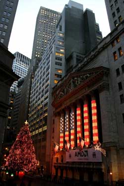 | 12日,美国纽约华尔街上的纽约证券交易所彩灯闪耀。 新华社记者 侯俊