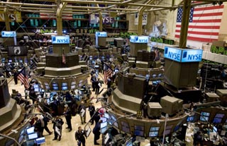 图为交易员在美国纽约证券交易所内忙碌。本报资料照片