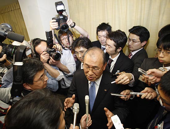 2月19日,东芝公司总裁兼首席执行官西田厚聪在日本东京举行的新闻发布会上被记者包围。当天,东芝正式宣布全面退出高清DVD(HD DVD)业务,而新一代DVD制式之争将以索尼的蓝光(BLUE RAY)技术阵营获胜告终。新华社/路透