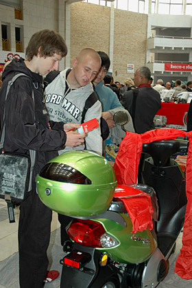 | 在俄罗斯西南部城市沃罗涅日举行的重庆商品展上,俄罗斯观众被重庆生产的摩托车吸引。新华社记者 刘轶芳