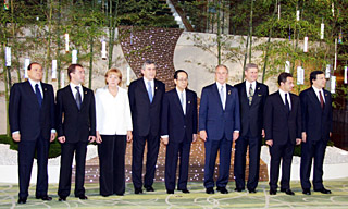 | 7日,在日本北海道洞爷湖,参加八国集团首脑会议的领导人在竹子装饰前合影,从左至右依次为意大利总理贝卢斯科尼、俄罗斯总统梅德韦杰夫、德国总理默克尔、英国首相布朗、日本首相福田康夫、美国总统布什、加拿大总理哈珀、法国总统萨科齐和欧盟委员会主席巴罗佐。新华社发 | 八国集团(G8)领导人8日在日本北海道洞爷湖举行第二天的闭门工作会议,并在会后发表声明,就共同关心的问题表明了立场。声明涉及温室气体减排、能源价格飙升、多哈回合谈判和“海利根达姆进程”等若干热点问题。
