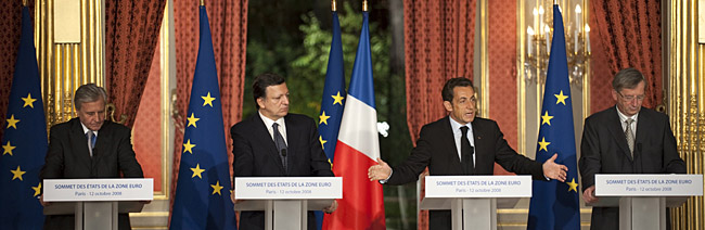 | 图为12日,在法国首都巴黎,(从左至右)欧洲中央银行行长特里谢、欧盟委员会主席巴罗佐、欧盟轮值主席国法国总统萨科齐和欧元集团主席、卢森堡首相容克出席联合新闻发布会。欧元区15国领导人当天在巴黎召开的首脑会议上通过一项行动计划,同意由各国政府为银行再融资提供担保并向银行注资,以共同应对当前的金融危机。新华社/路透 |