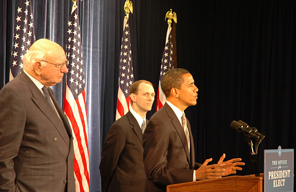 | 26日,美国当选总统奥巴马(右)在芝加哥召开的新闻发布会上讲话。奥巴马当日宣布,将成立一个经济复苏顾问委员会,并提名美国联邦储备委员会前主席保罗·沃尔克(左)来领导这一新的经济团队。新华社记者