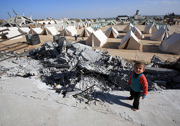 1月31日,在加沙地带北部的贾巴利亚,一名儿童站在一个由帐篷组成的临时居民点外。以军持续22天的“铸铅行动”导致加沙地带大量建筑被损毁,而停火之后以色列对加沙的持续封锁以及巴勒斯坦内部对接受国际援助问题的分歧使得加沙重建工作进展缓慢。